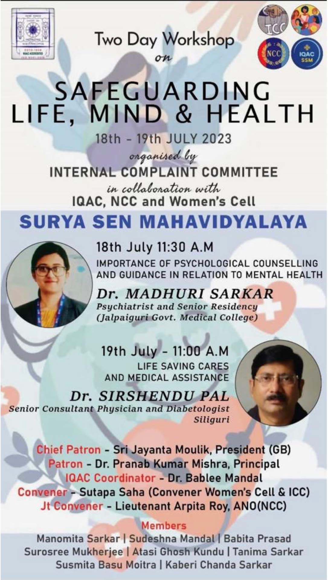 Internal Complaints Committee (ICC) is a mandatory committee in Surya Sen Mahavidyalaya that receives and redresses complaints of sexual harassment or any kind of misconduct or misbehaviour on the part of students and staff.